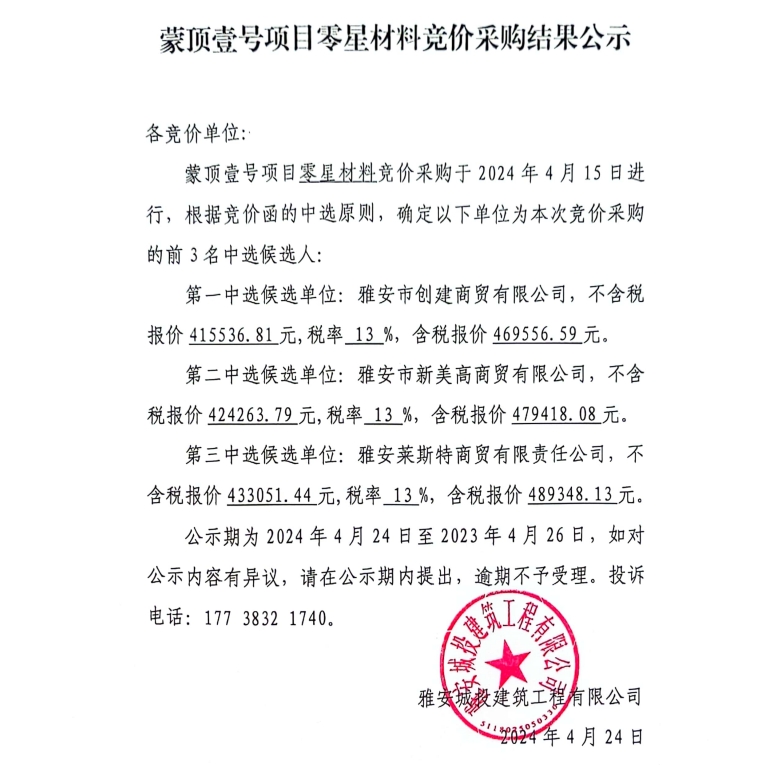 蒙頂壹號項目零星材料競價采購結(jié)果公示