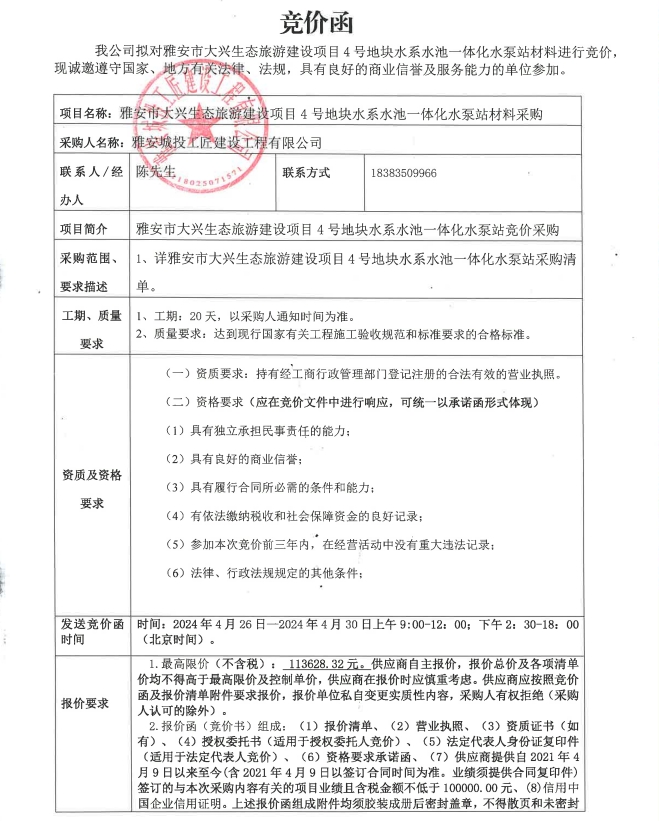 雅安市大興生態(tài)旅游建設(shè)項(xiàng)目4號(hào)地塊水系水池一體化水泵站材料采購(gòu)競(jìng)價(jià)公告