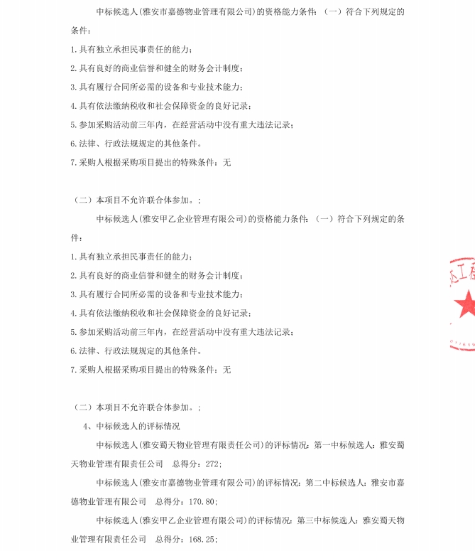 雅州壹號院臨時售樓部物業(yè)服務(wù)中標(biāo)候選人公示