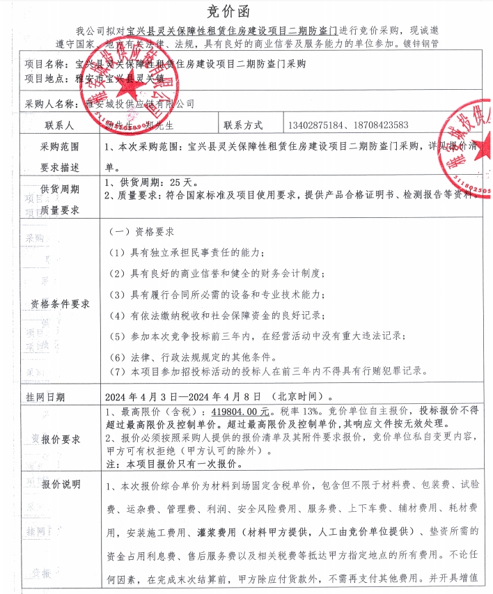 寶興縣靈關(guān)保障性租賃住房建設(shè)項(xiàng)目二期防盜門采購競價(jià)公告