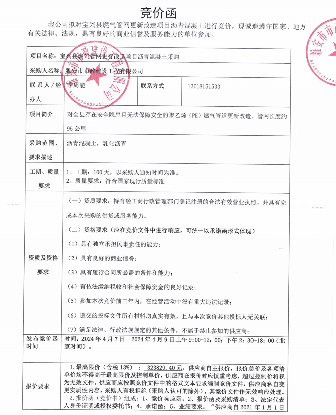 寶興縣燃氣管網(wǎng)更新改造項目瀝青混凝土競價公告