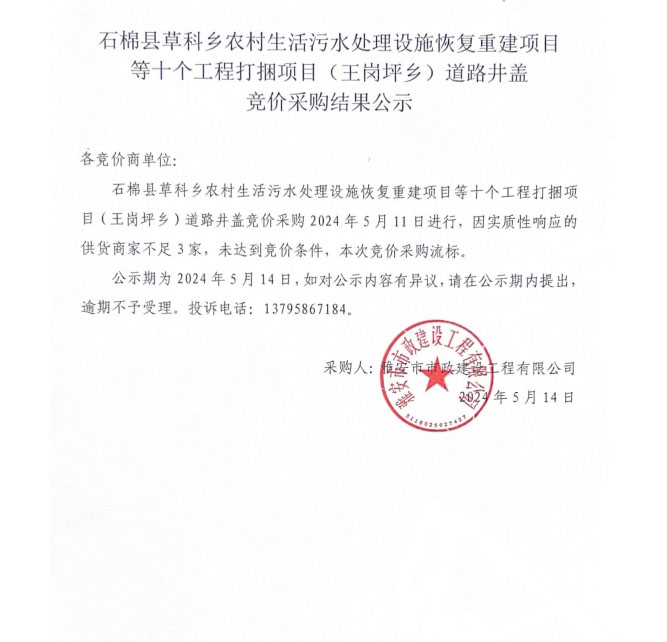 石棉縣草科鄉(xiāng)農(nóng)村生活污水處理設(shè)施恢復(fù)重建項(xiàng)目等十個(gè)工程打捆項(xiàng)目(王崗坪鄉(xiāng))道路井蓋競(jìng)價(jià)采購結(jié)果公示
