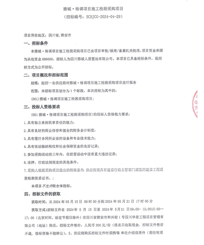 雅城·格調(diào)項目施工檢測采購項目公告