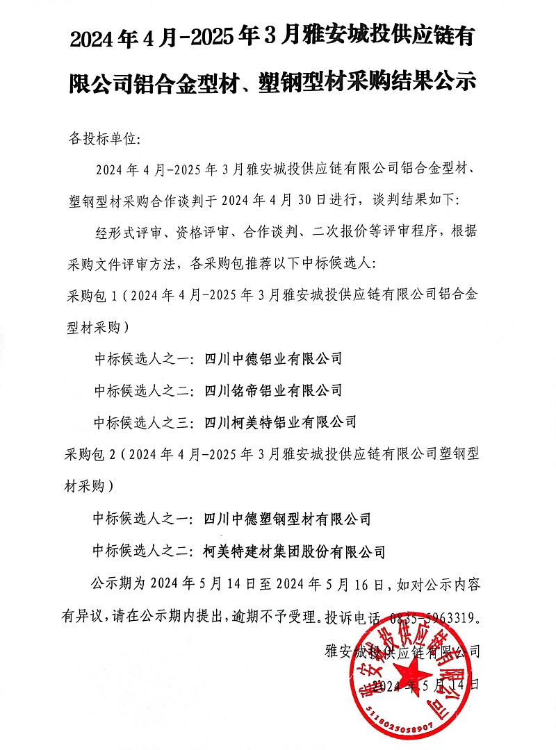 2024年4月-2025年3月雅安城投供應(yīng)鏈有限公司鋁合金型材、塑鋼型材采購(gòu)結(jié)果公示