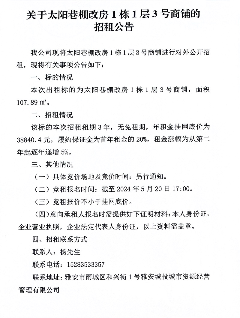 關(guān)于太陽(yáng)巷棚改房1棟1層3號(hào)商鋪的招租公告