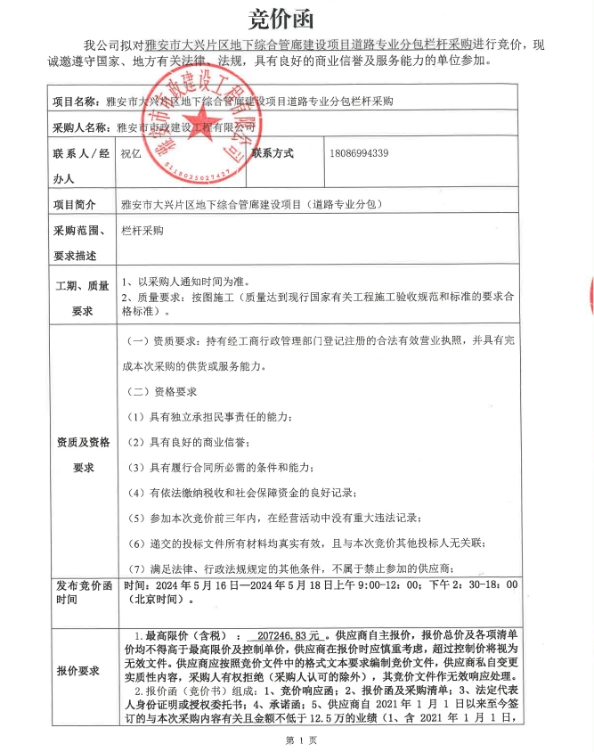雅安市大興片區(qū)地下綜合管廊建設(shè)項(xiàng)目道路專業(yè)分包欄桿采購(gòu)競(jìng)價(jià)公告