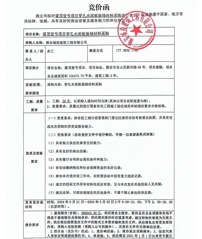 蒙頂壹號項目穿孔水泥板裝修材料采購競價公告
