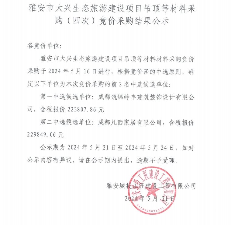 雅安市大興生態(tài)旅游建設(shè)項(xiàng)目吊頂?shù)炔牧喜少彛ㄋ拇危└們r(jià)采購結(jié)果公示