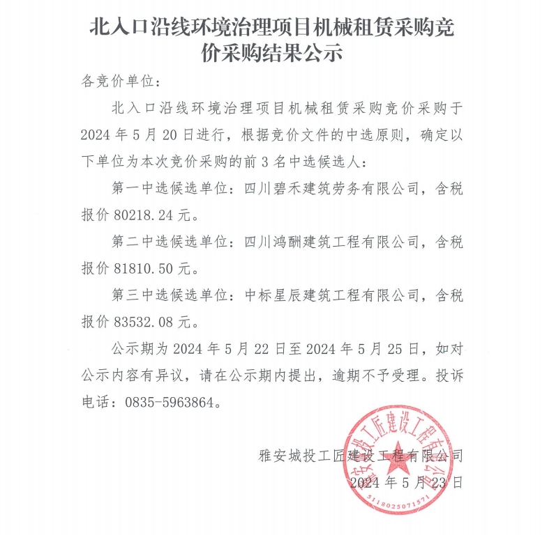 北入口沿線環(huán)境治理項目機(jī)械租賃采購競價采購結(jié)果公示
