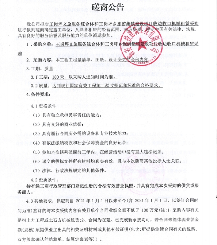 王崗坪文旅服務(wù)綜合體和王崗坪鄉(xiāng)旅游集鎮(zhèn)建設(shè)項目收邊收口機(jī)械租賃采購談判磋商公告