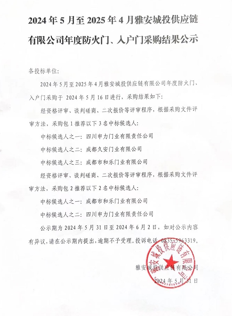 2024年5月至2025年4月雅安城投供應鏈有限公司年度防火門、入戶門采購結果公示