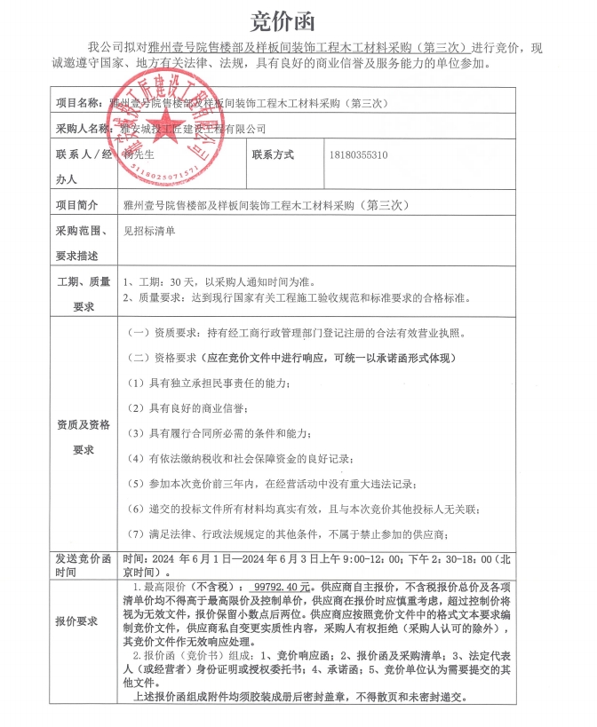 競(jìng)價(jià)函-木工材料采購(gòu)-雅州壹號(hào)院售樓部及樣板間(第三次)