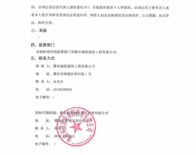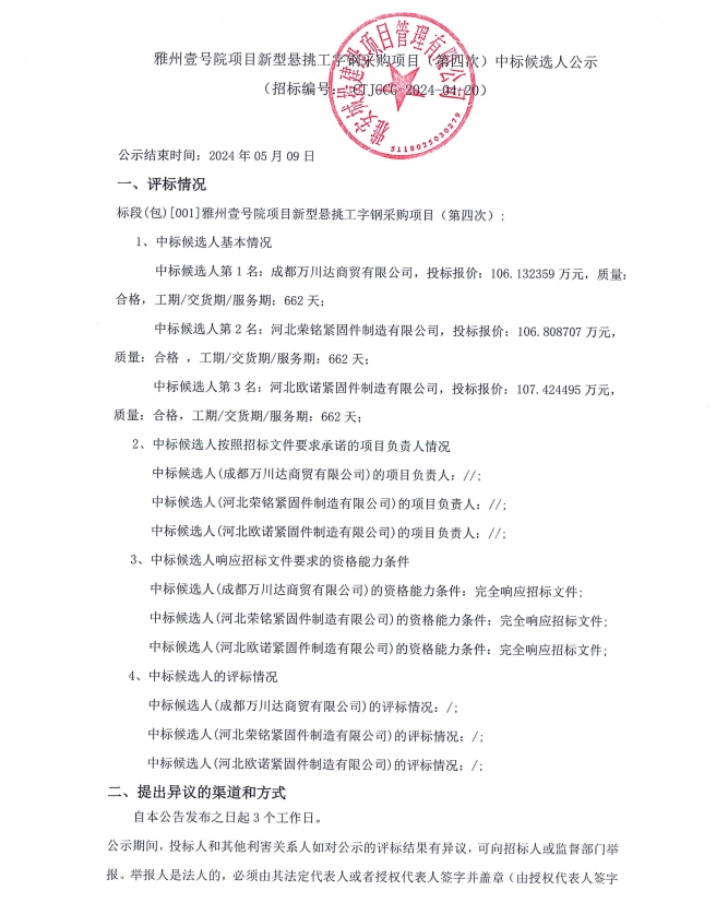 雅州壹號院項目新型懸挑工字鋼采購項目(第四次)中標候選人公示