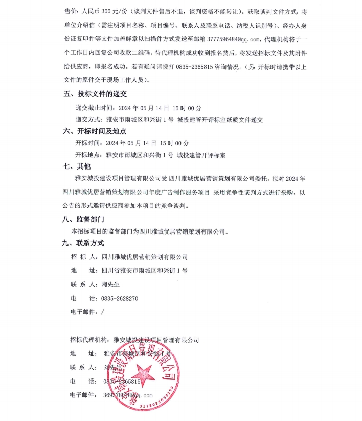 2024年四川雅城優(yōu)居營銷策劃有限公司年度廣告制作服務項目公告