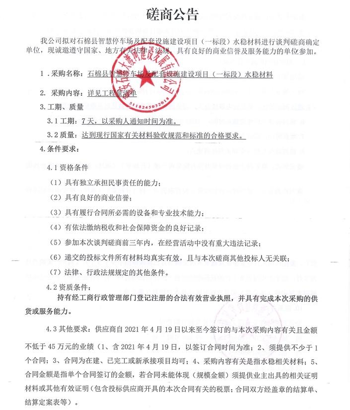 石棉縣智慧停車場(chǎng)及配套設(shè)施建設(shè)項(xiàng)目(一標(biāo)段)水穩(wěn)材料采購(gòu)談判磋商公告