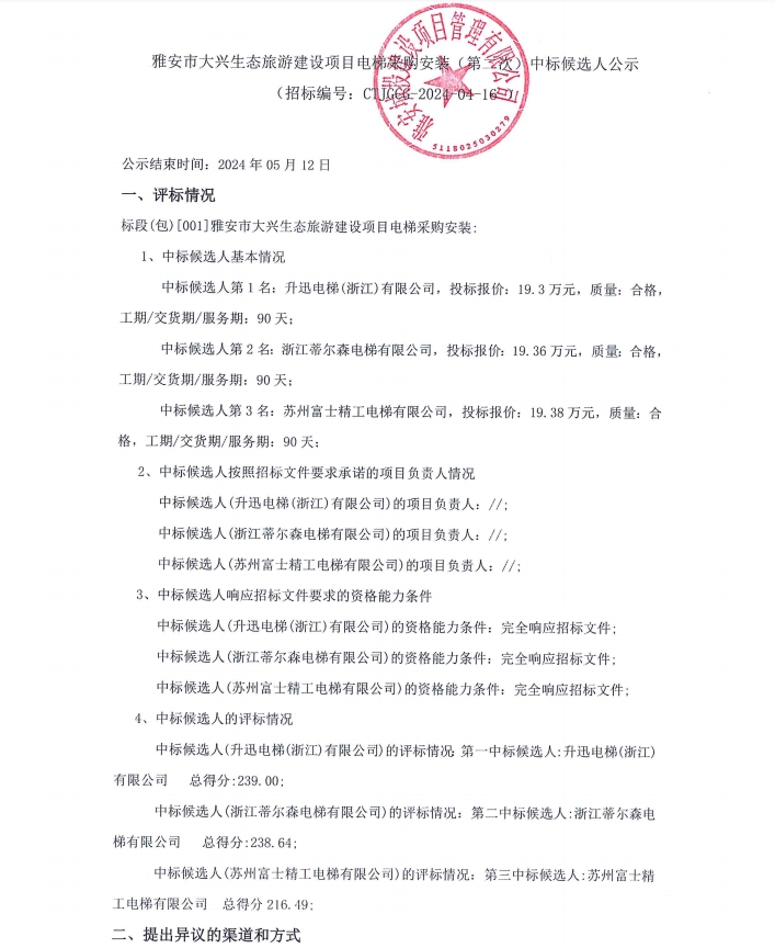 雅安市大興生態(tài)旅游建設(shè)項(xiàng)目電梯采購(gòu)安裝(第二次)中標(biāo)候選人公示