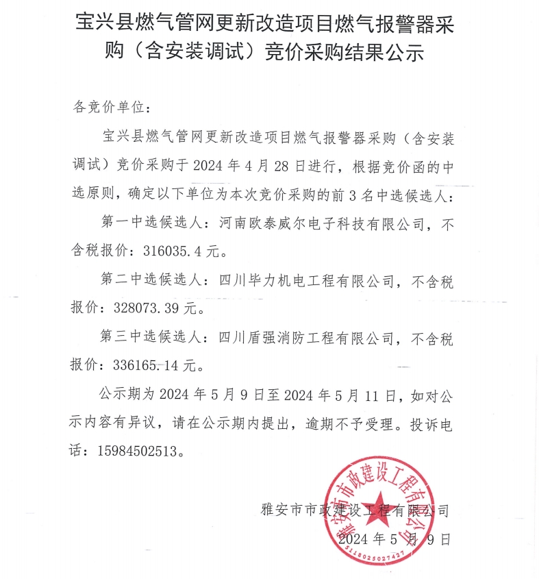 寶興縣燃氣管網(wǎng)更新改造項目燃氣報警器采購(含安裝調(diào)試)競價采購結(jié)果公示