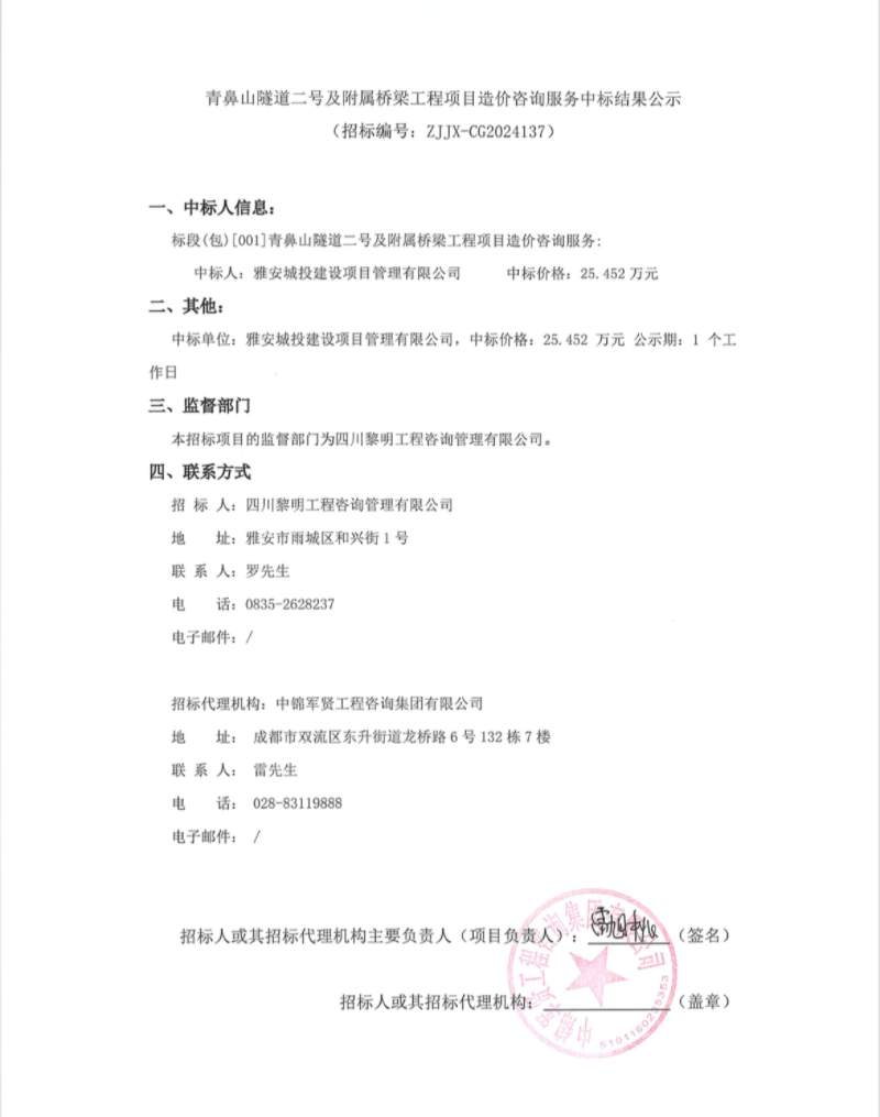 青鼻山隧道二號及附屬橋梁工程項(xiàng)目造價咨詢服務(wù)中標(biāo)結(jié)果公示