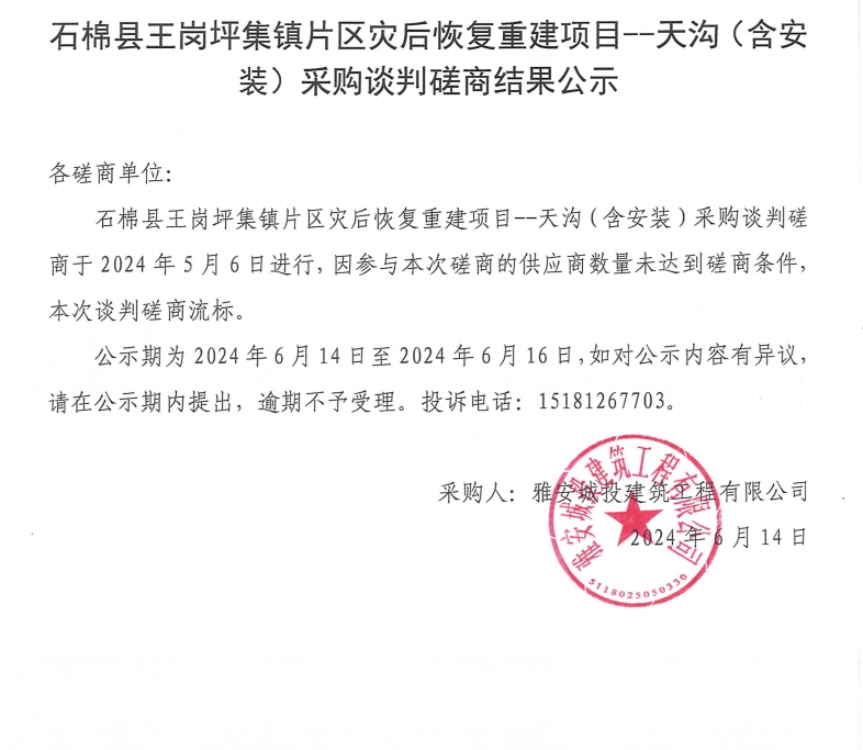 石棉縣王崗坪集鎮(zhèn)片區(qū)災后恢復重建項目--天溝(含安裝)采購談判磋商結果公示