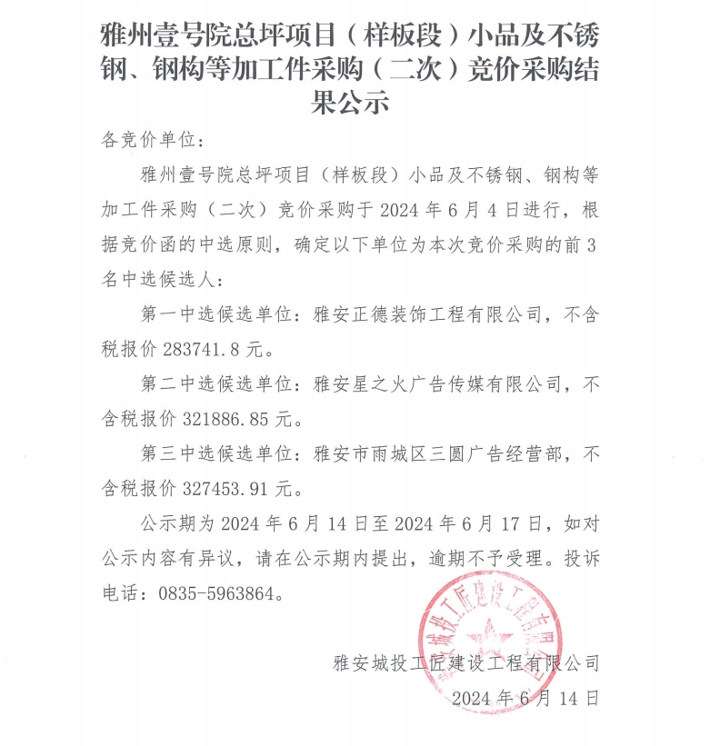 雅州壹號院總坪項目(樣板段)小品及不銹鋼、鋼構等加工件采購(二次)競價采購結果公示