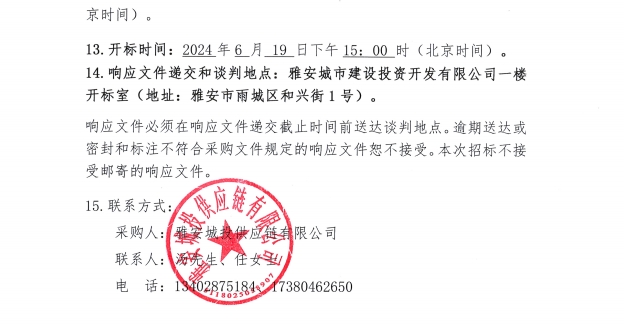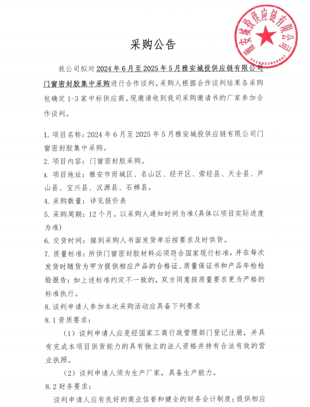 2024年6月至2025年5月雅安城投供應鏈有限公司門窗密封膠集中采購公告