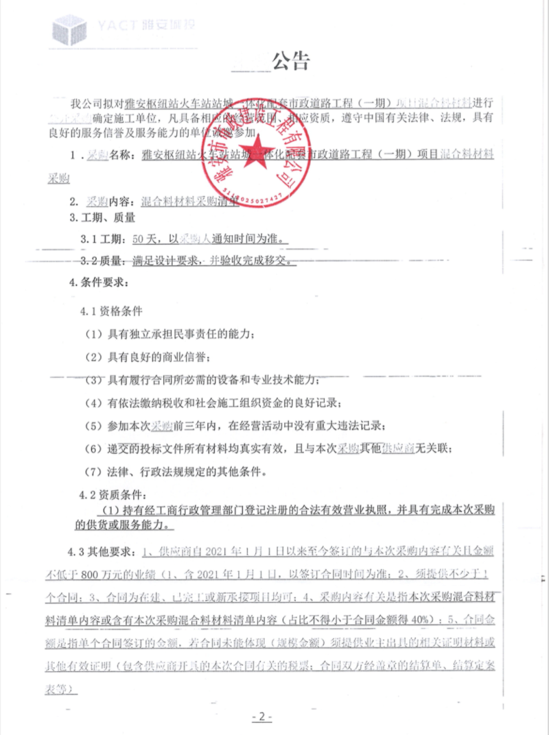 雅安樞紐站火車站站城一體化配套市政道路工程(一期)項目混合材料采購公告
