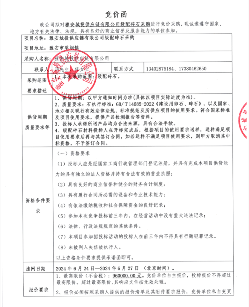 雅安城投供應(yīng)鏈有限公司級(jí)配碎石采購(gòu)競(jìng)價(jià)公告