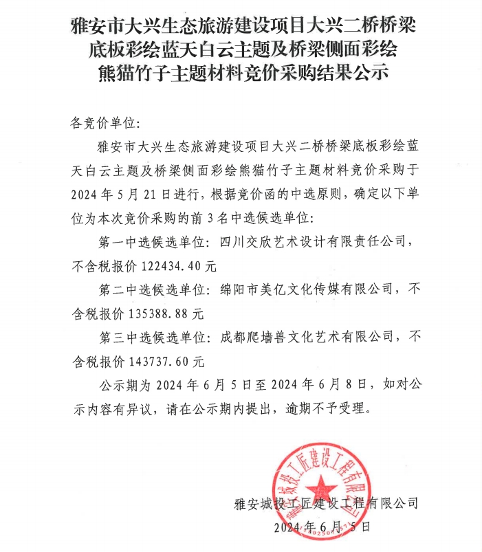 雅安市大興生態(tài)旅游建設(shè)項目大興二橋橋梁底板彩繪藍(lán)天白云主題及橋梁側(cè)面彩繪熊貓竹子主題材料采購結(jié)果公示