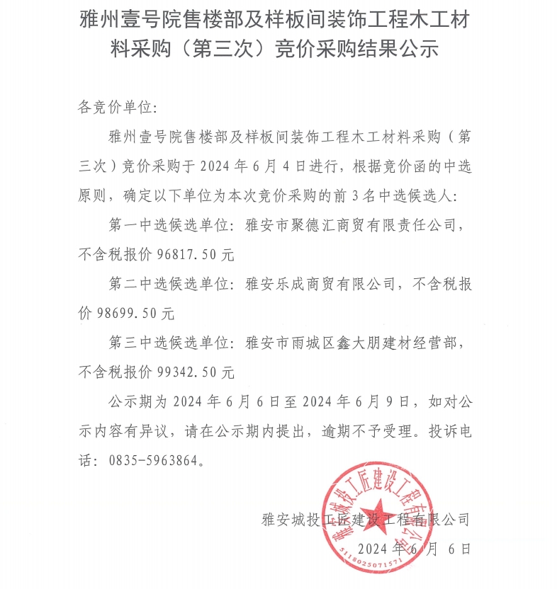雅州壹號(hào)院售樓部及樣板間裝飾工程木工材料采購(gòu)(第三次)競(jìng)價(jià)采購(gòu)結(jié)果公示