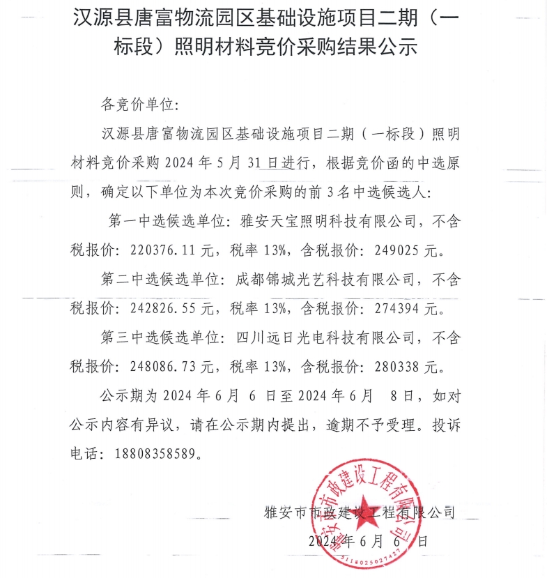 漢源縣唐富物流園區(qū)基礎(chǔ)設(shè)施項(xiàng)目二期(一標(biāo)段)照明材料競價(jià)采購結(jié)果公示