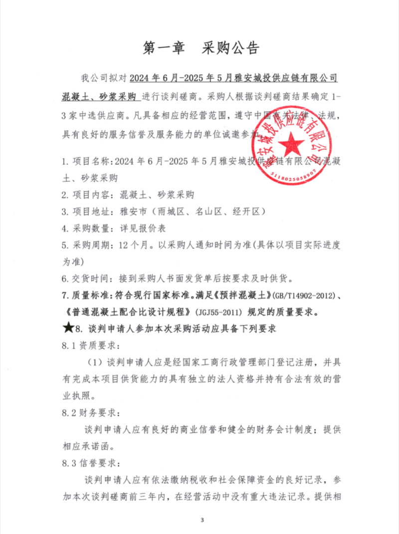 2024年6月-2025年5月雅安城投供應(yīng)鏈有限公司混凝土、砂漿采購公告