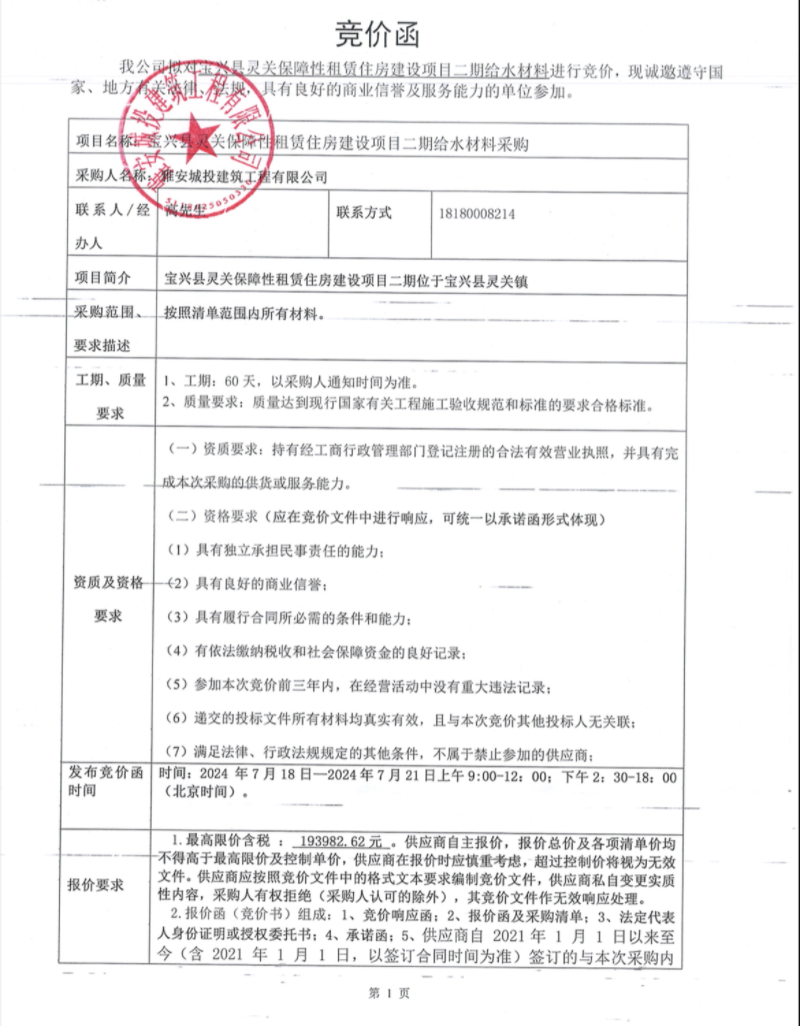 寶興縣靈關(guān)保障性租賃住房建設(shè)項目二期給水材料競價公告