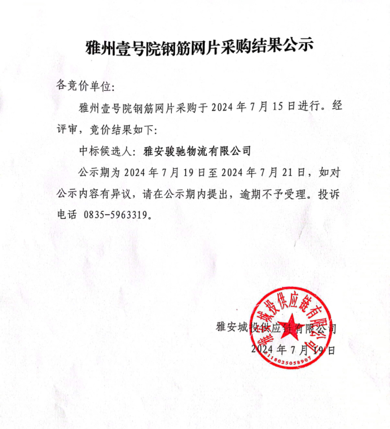 雅州壹號院鋼筋網(wǎng)片采購結(jié)果公示