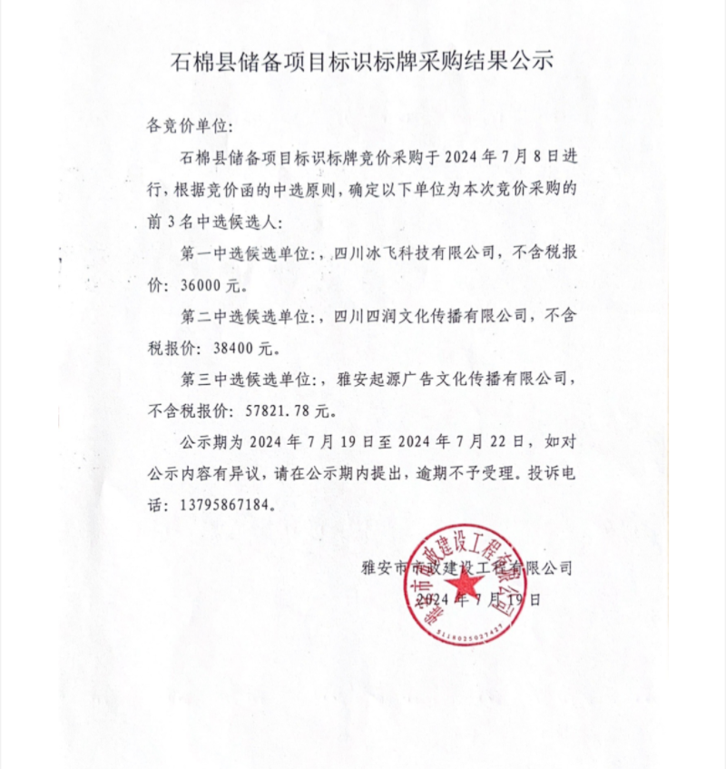 石棉縣儲備項目標(biāo)識標(biāo)牌采購結(jié)果公示