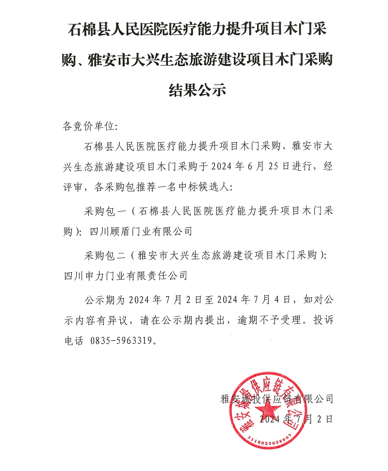 石棉縣人民醫(yī)院醫(yī)療能力提升項(xiàng)目木門(mén)采購(gòu)、雅安市大興生態(tài)旅游建設(shè)項(xiàng)目木門(mén)采購(gòu)結(jié)果公示