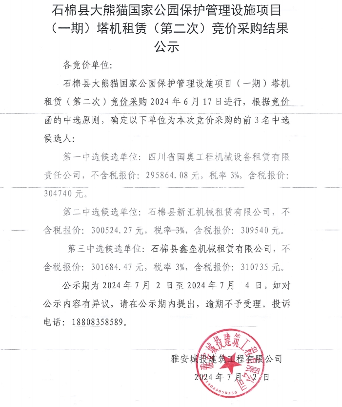 石棉縣大熊貓國(guó)家公園保護(hù)管理設(shè)施項(xiàng)目(一期)塔機(jī)租賃(第二次)競(jìng)價(jià)采購(gòu)結(jié)果公示