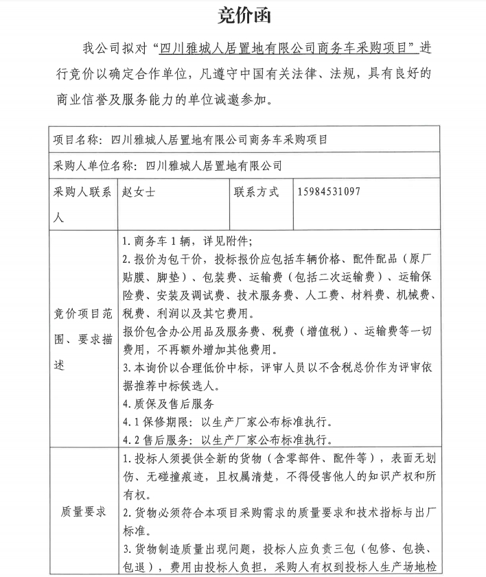 四川雅城人居置地有限公商務(wù)車采購項目競價公告