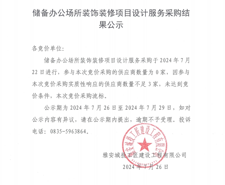 儲(chǔ)備辦公場(chǎng)所裝飾裝修項(xiàng)目設(shè)計(jì)服務(wù)采購結(jié)果公示
