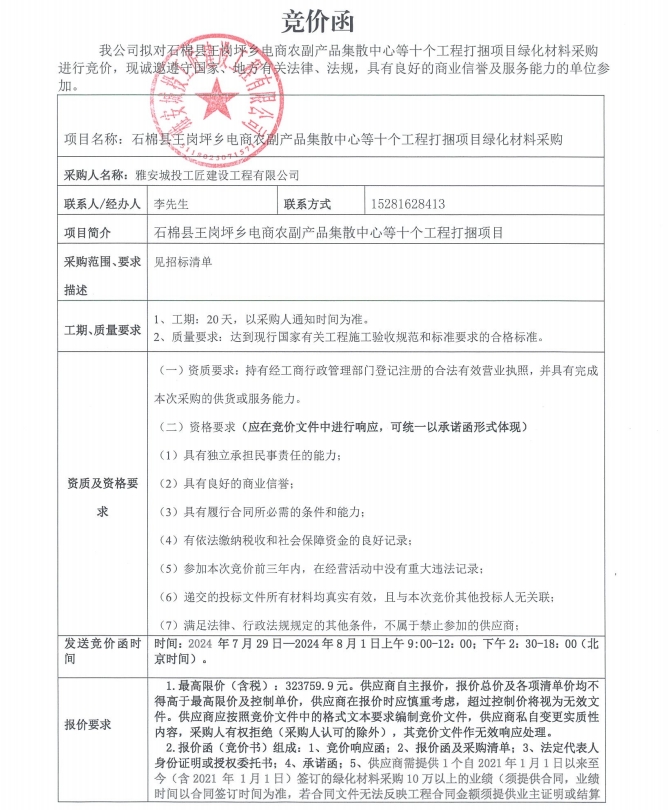 石棉縣王崗坪鄉(xiāng)電商農(nóng)副產(chǎn)品集散中心等十個(gè)工程打捆項(xiàng)目綠化材料競價(jià)函