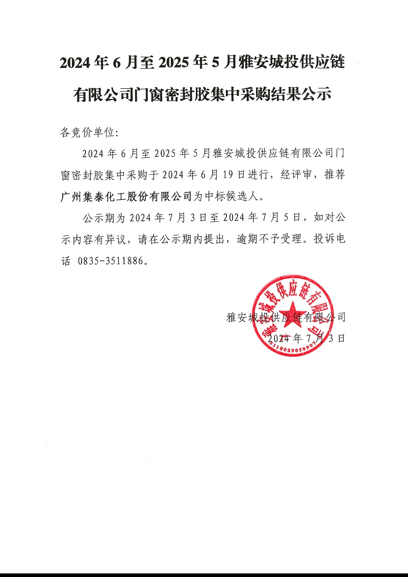 2024年6月至2025年5月雅安城投供應鏈有限公司門窗密封膠集中采購結(jié)果公示