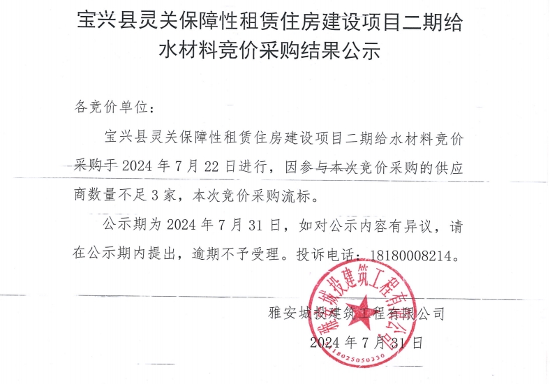 寶興縣靈關(guān)保障性租賃住房建設(shè)二期給水材料競價(jià)采購結(jié)果公示