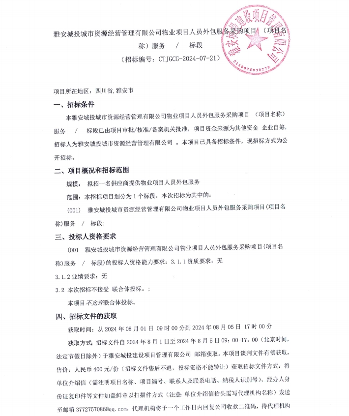 雅安城投城市資源經(jīng)營管理有限公司物業(yè)項目人員外包服務(wù)采購項目(項目名稱)服務(wù)/標(biāo)段公告