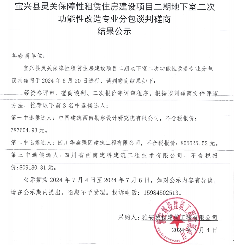寶興縣靈關(guān)保障性租賃住房建設(shè)項(xiàng)目二期地下室二次項(xiàng)目性改造專業(yè)分包談判磋商結(jié)果公示