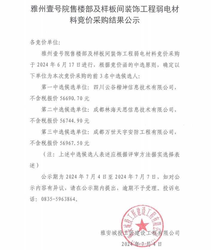 雅州壹號院售樓部及樣板間裝飾工程弱電材料競價(jià)采購結(jié)果公示