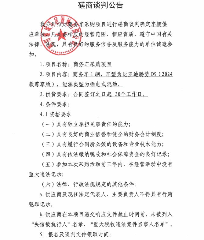 商務車采購項目磋商談判公告