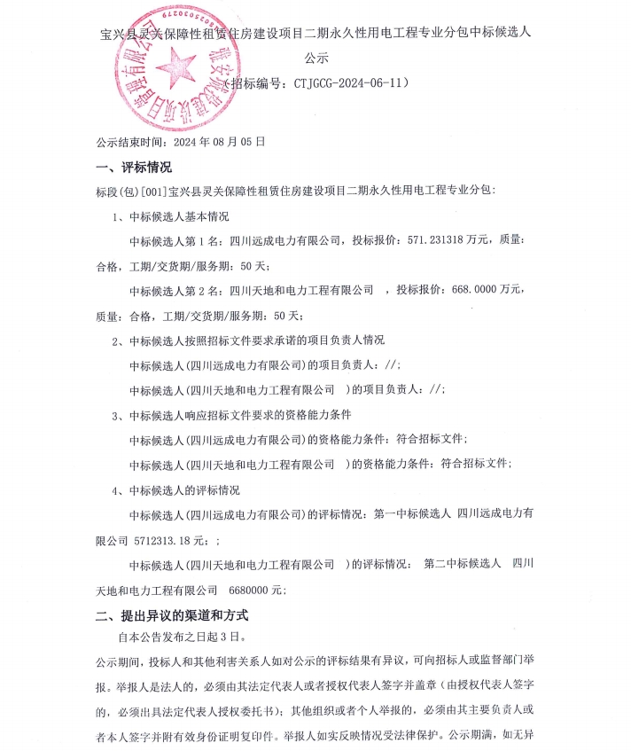 寶興縣靈關保障性租賃住房建設項目二期永久性用電工程專業(yè)分包中標候選人公示