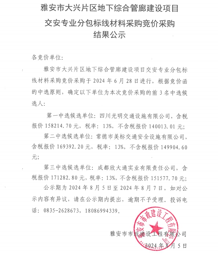 雅安市大興片區(qū)地下綜合管廊建設(shè)項(xiàng)目道路專(zhuān)業(yè)分包標(biāo)線(xiàn)材料采購(gòu)競(jìng)價(jià)采購(gòu)結(jié)果公示