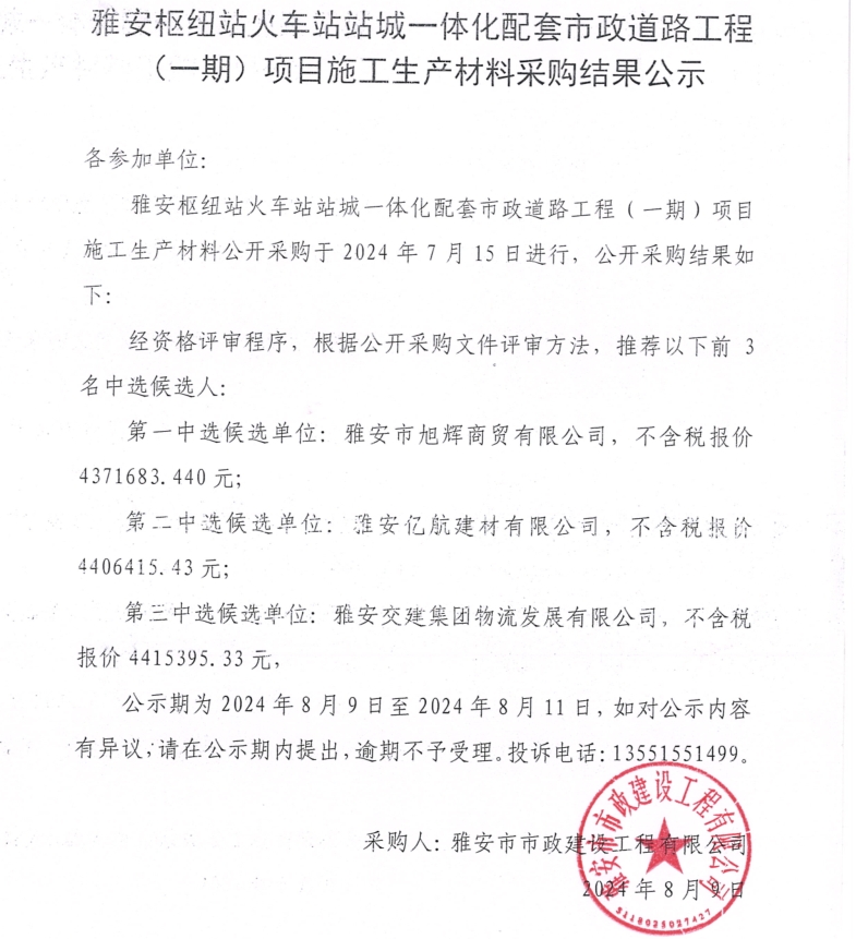 雅安樞紐站火車站站城一體化配套市政道路工程(一期)項目施工生產(chǎn)材料采購結(jié)果公示