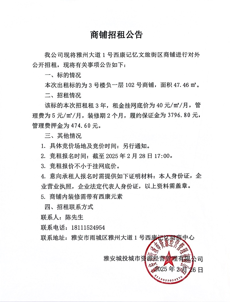 關(guān)于雅州大道1號西康記憶文旅街區(qū)3號樓負一層102號商鋪招租公告