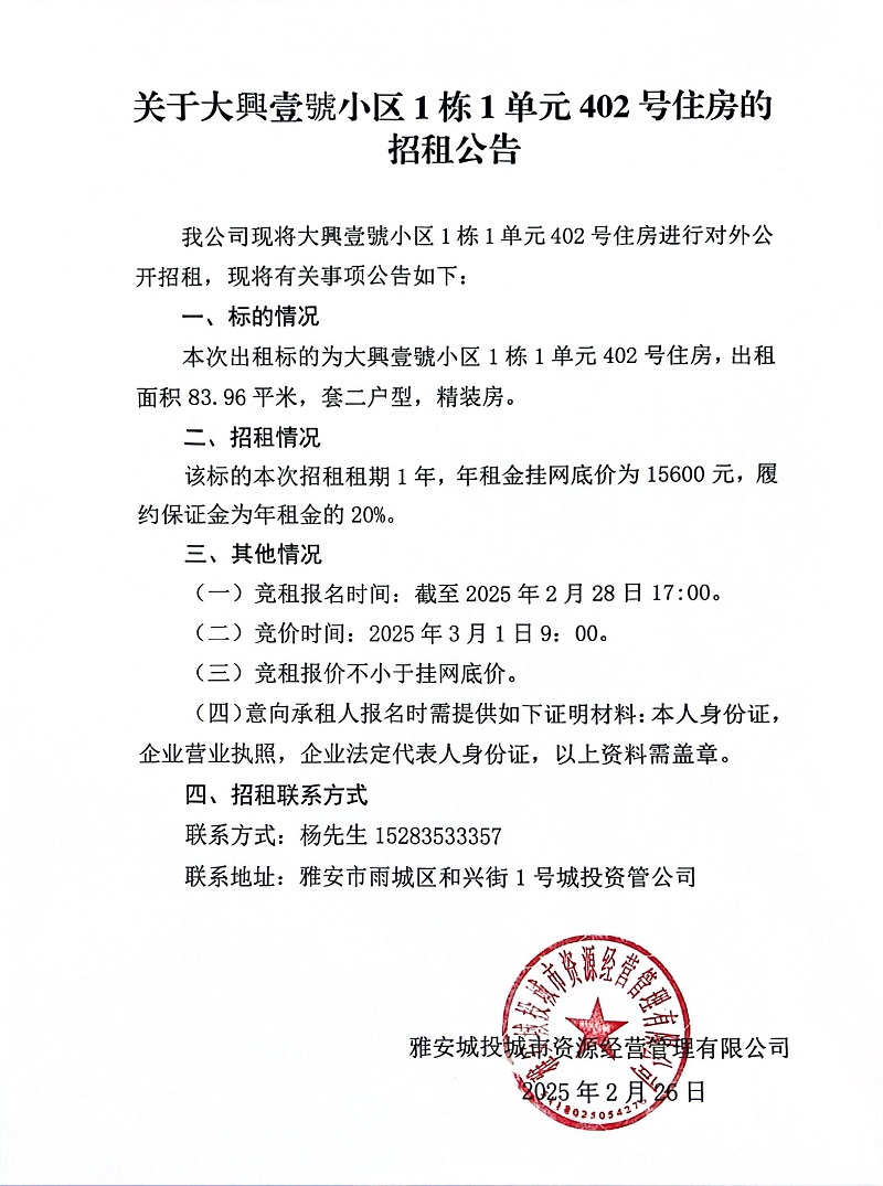 關(guān)于大興壹號小區(qū)1棟1單元402號住房的招租公告